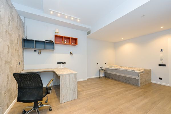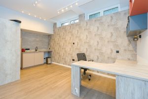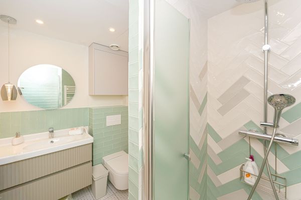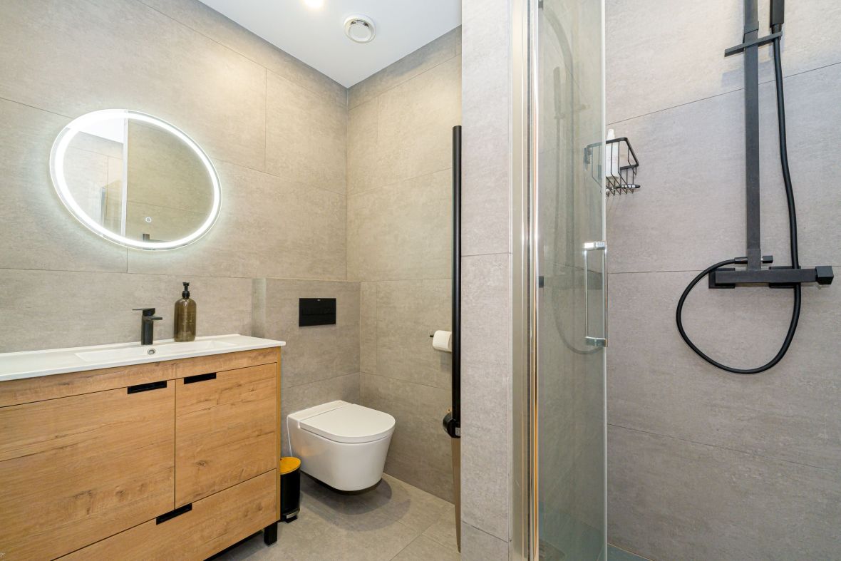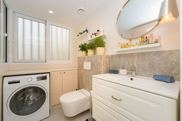 En la planta principal, un elegante recibidor da paso a un amplio living-comedor lleno de luz, con salida directa al patio privado, ideal para desayunos al sol o cenas relajadas. En esta misma planta encontramos un estudio independiente, perfecto como despacho o sala creativa, y un baño completo que aporta funcionalidad al día a día.