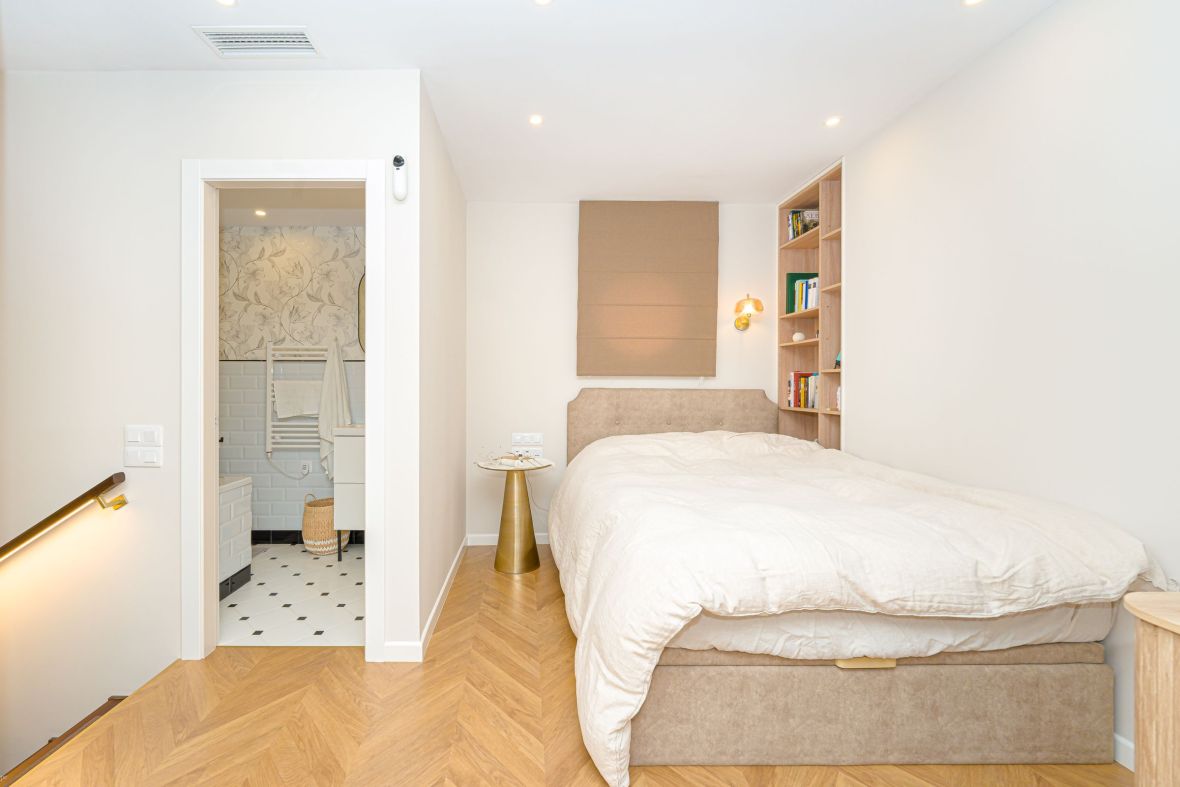 La tercera planta es, sin duda, uno de los espacios más especiales de la vivienda. Una habitación de invitados con terraza privada ofrece vistas abiertas, acompañada de un baño amplio con bañera, creando una experiencia casi de hotel boutique para quienes se alojan allí.